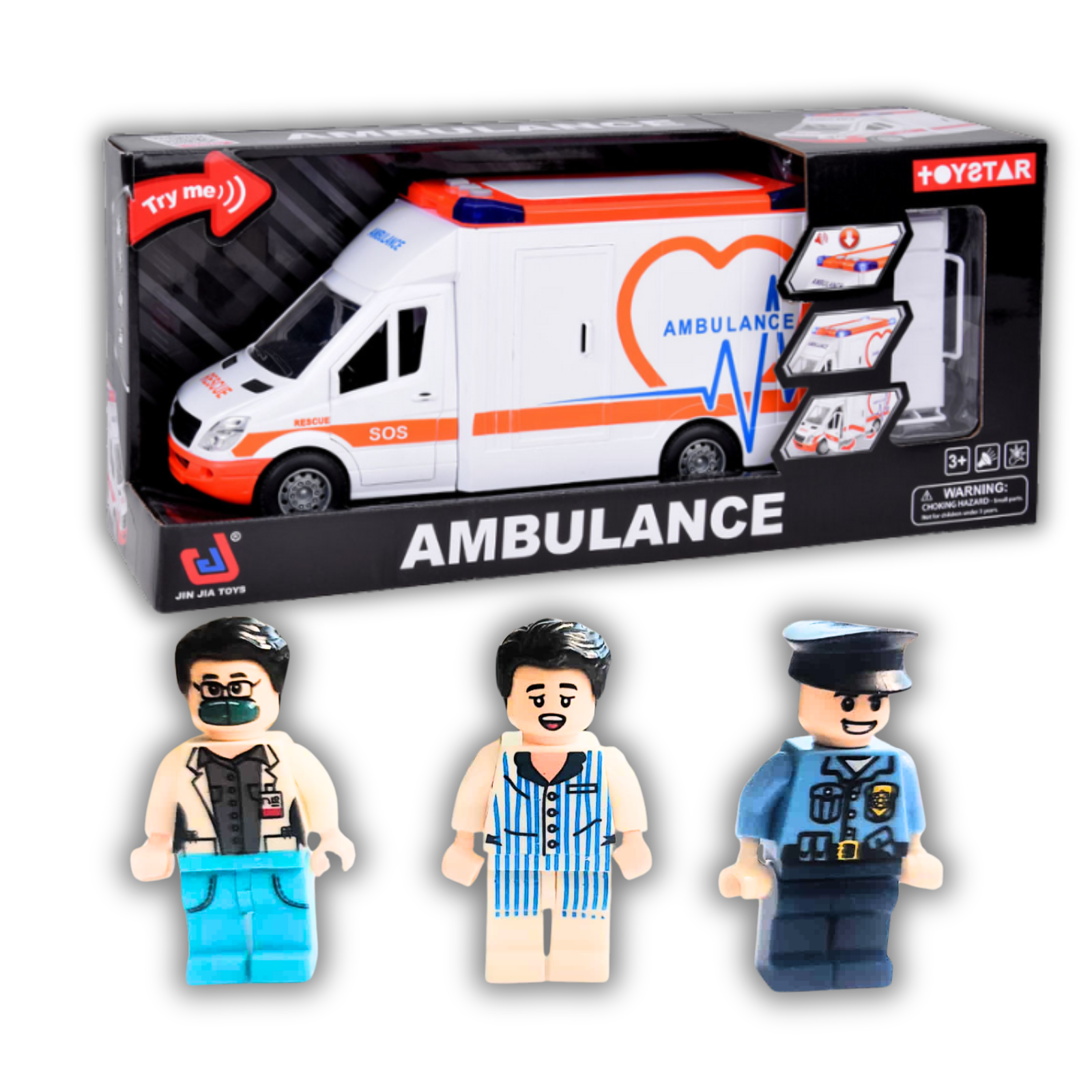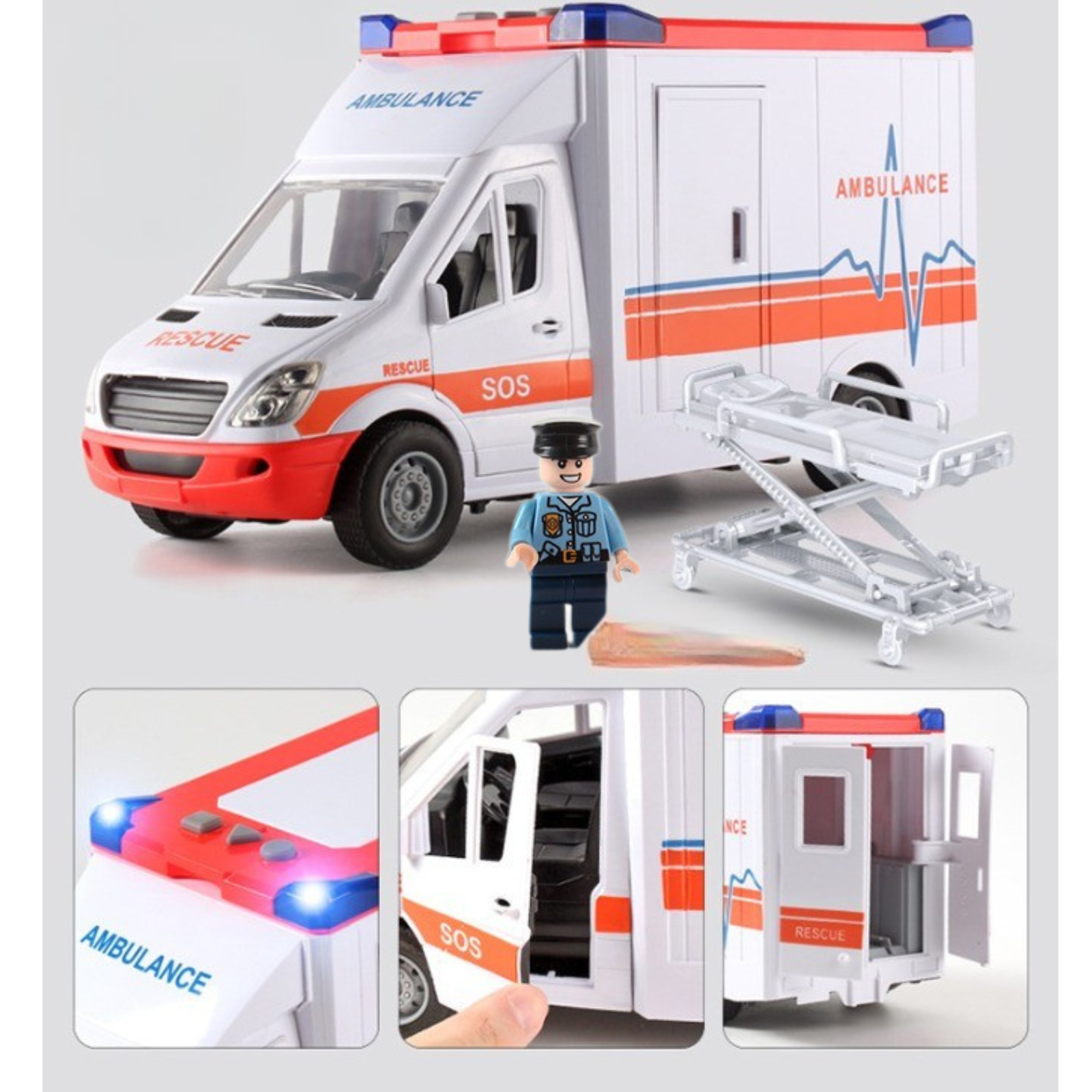Po naciśnięciu przycisków na dachu, włączają się migające światła oraz realistyczne dźwięki syren, klaksonu i silnika — tak jak w prawdziwej karetce!