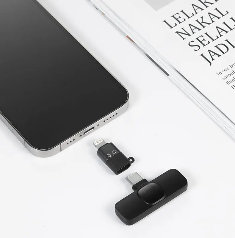 Urządzenie jest wyposażone w mały mikrofon, który umożliwia dyskretną i wygodną transmisję dźwięku bez konieczności trzymania mikrofonu w ręku. Odbiornik mikrofonu podłączamy do telefonu/tabletu/komputera (złącze USB-C + adapter na Lightning).