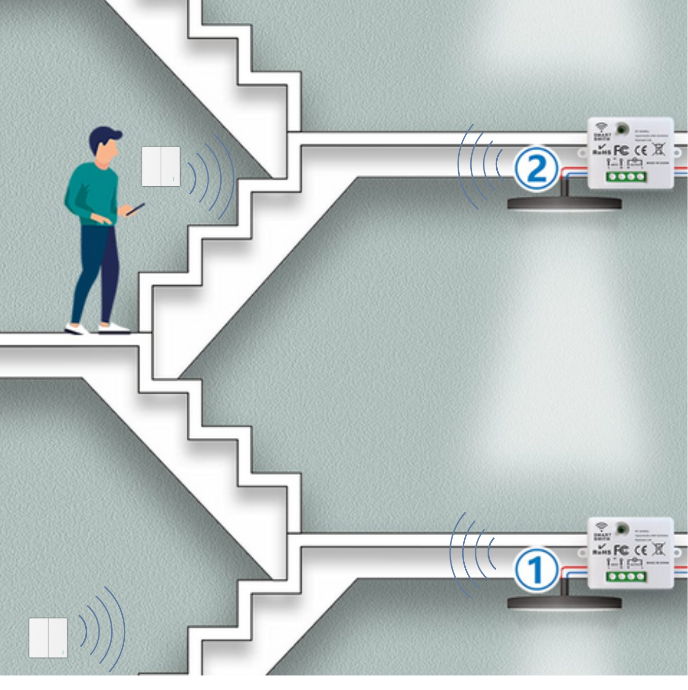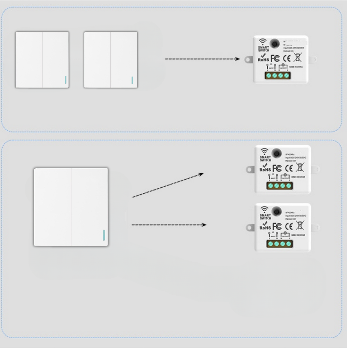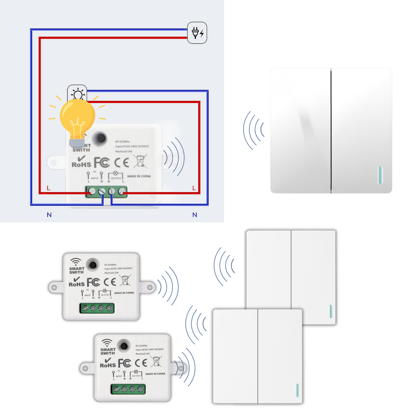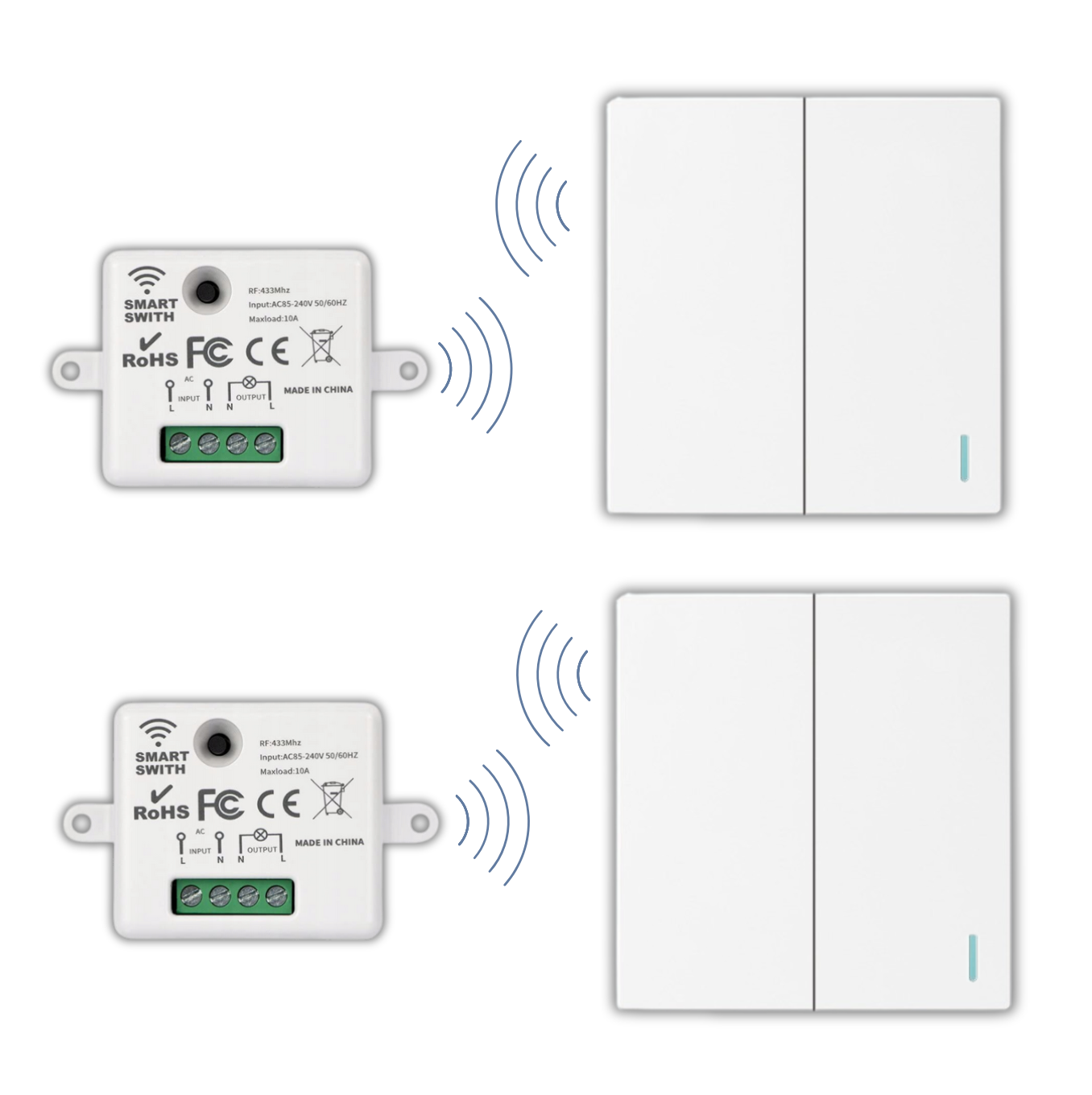 Zestaw zawiera dwa podwójne włączniki oraz dwa odbiorniki RF 433 MHz o maksymalnym prądzie 10 A i mocy 2200 W. Umożliwia wygodne sterowanie oświetleniem w domu, mieszkaniu, garażu, na tarasie czy w kamperze bez konieczności wiercenia czy prowadzenia kabli.