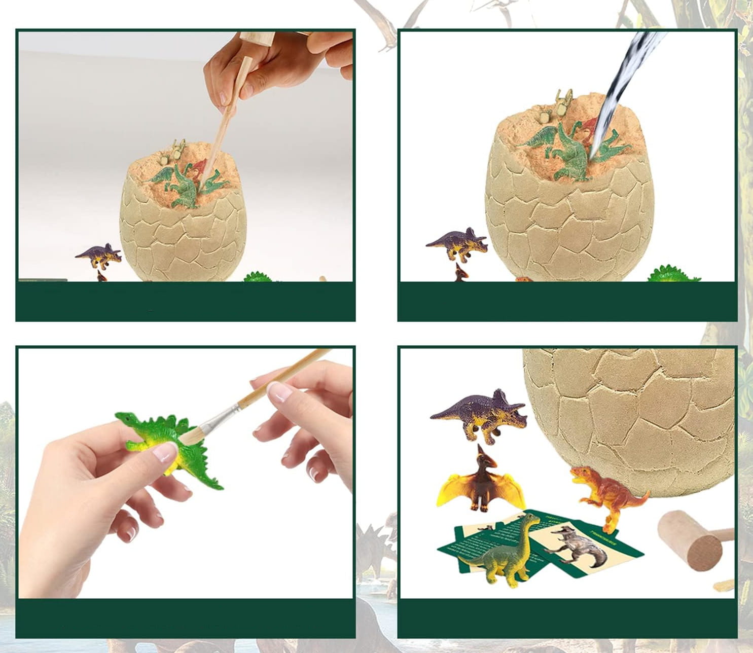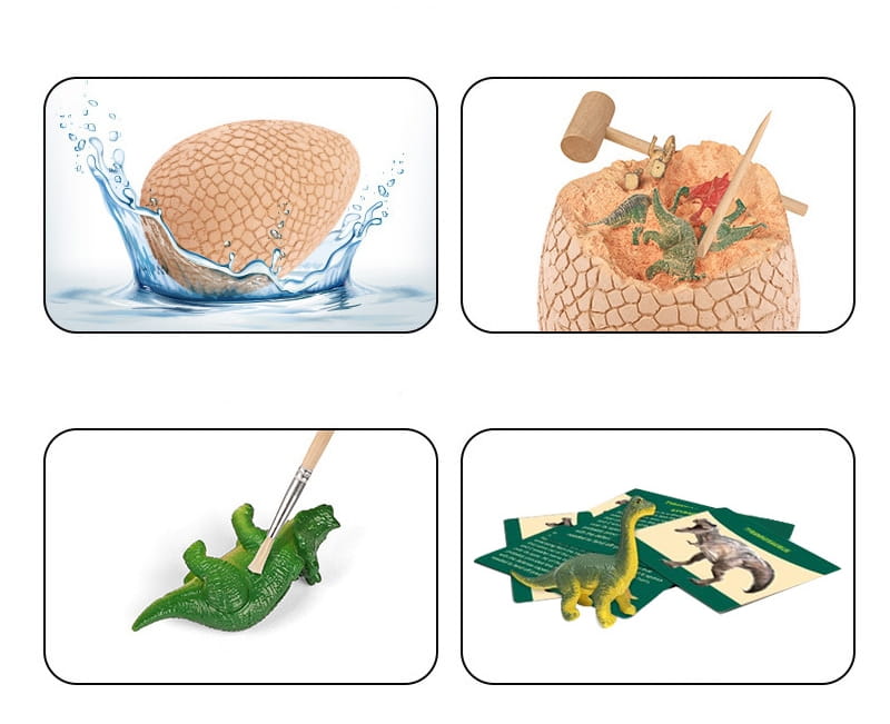 - Wykop figurki dinozaurów: Przed przystąpieniem do wykopywaniu dinozaurów możesz zanurzyć bryłę w wodzie przez 5-10 minut ewentualnie spryskać wodą podczas kopania, zmiękczy to jajko i ułatwi zabawę. Użyj młotka i dłutka, aby delikatnie rozbić jajko i odkryć ukryte w środku dinozaury.